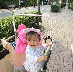 バギーに乗って、公園までの道のりを楽しんでいます。