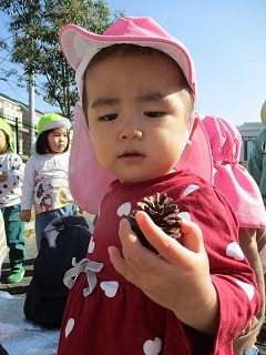 どんぐりを大切に持ちながら、他の自然物を探しに行っています。