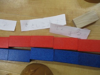 作った線路(積み木)の上や近くに、駅名が書いてある紙を置いて・・・