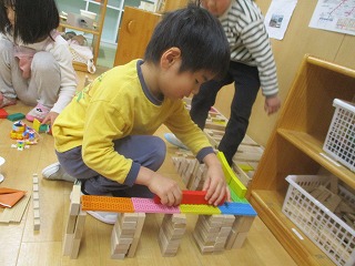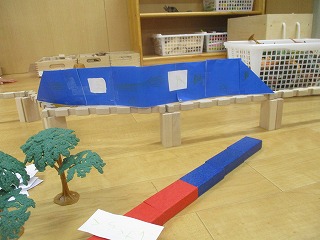 積み木を組み合わせてモノレールの路線も作って楽しんでいました。