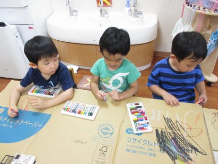 みんなで何やら段ボールに描いています。何を作っているのかな?