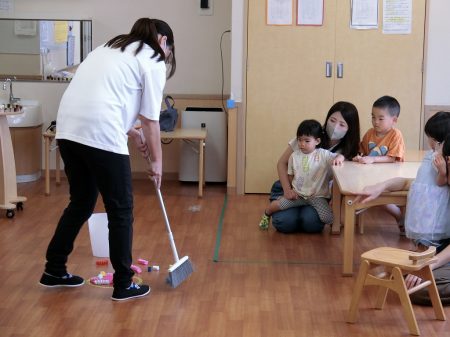 ほうきを使って掃除の練習をしています。保育士の提示を見て、友だちと掃除を楽しんでいました。