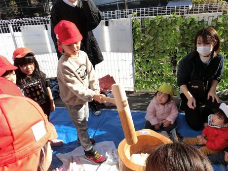 流石、幼児のみんな。そら組は自分で杵を持ち上げてついていましたよ。
