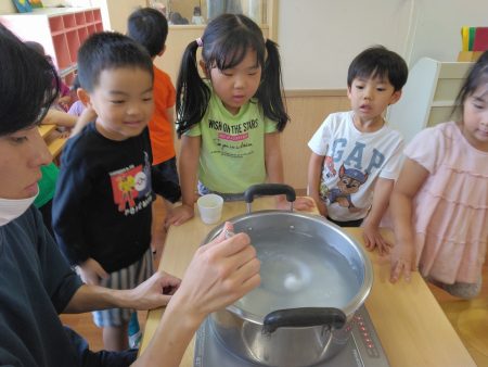 丸めた団子を鍋に一つずつ入れていきます。「お風呂に入って気持ちよさそう」と言ってまじまじと団子が動いている様子を見つめていましたよ。