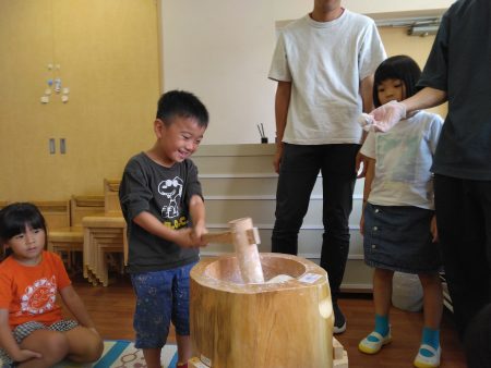 お正月のお餅と比べて、団子粉は伸びないことに気付き、「なんで、お月見団子は伸びないんだろう?」と不思議な様子でした。