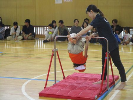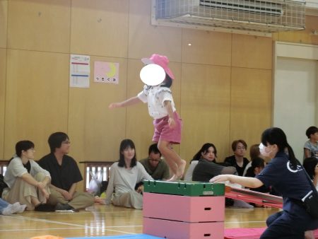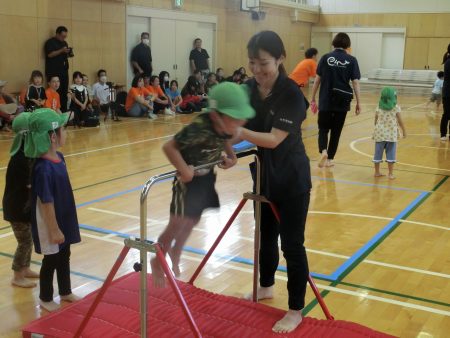 次はそら、つき、たいよう組のクラス競技普段から行っている運動遊びを中心に行いました。鉄棒、はしご、平均台、巧技台など様々な器具を使い