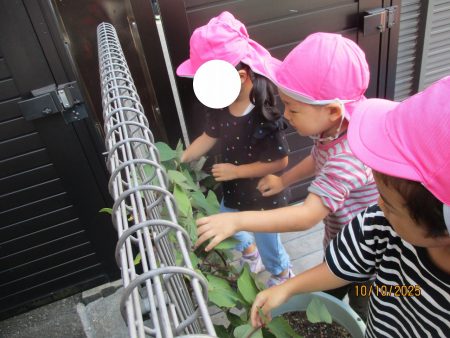 長々と伸びているツルに「わぁ、長い!」と言ってびっくりしている子どもたち。