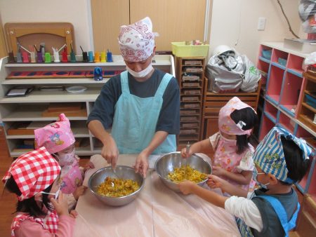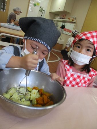 マッシャーを使い、さつまいもとかぼちゃを潰していきます。食材の堅さを感じながら楽しそうに潰していました。