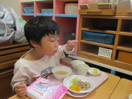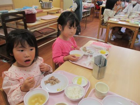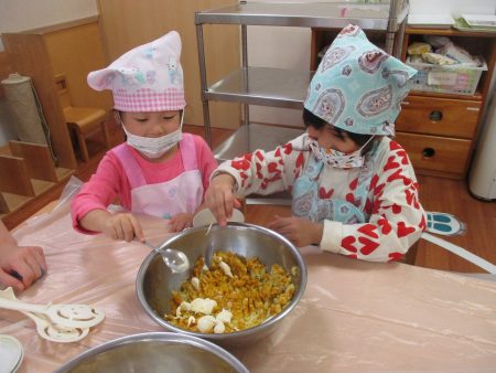 出来上がったさつまいもサラダは、4・5歳児のお友だちにも食べてもらいました。