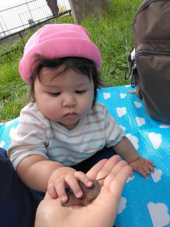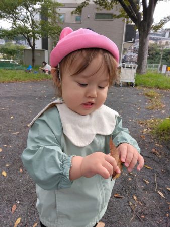 保育者と一緒に落ち葉に触れる姿が見られていました。