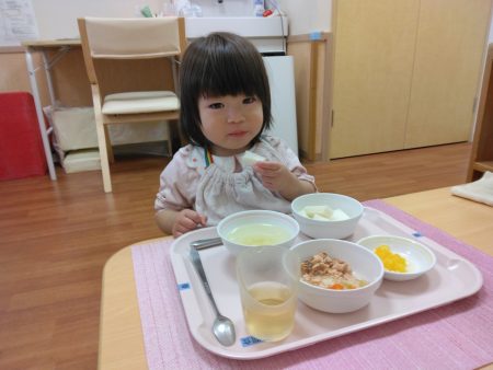 ランチョンマットの上に給食をのせて、食事を楽しみましたよ。