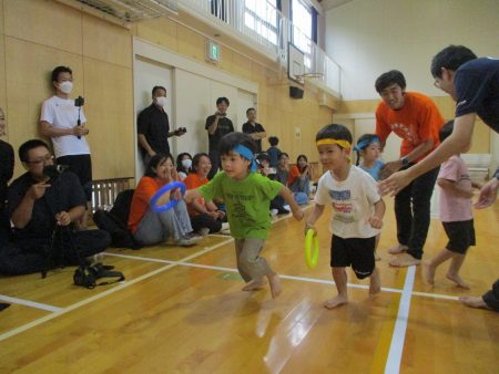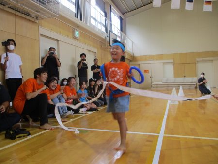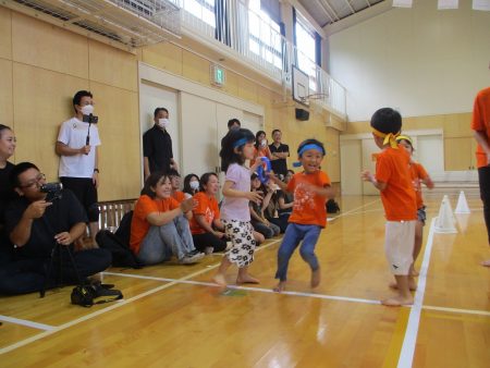 みんなでバトンを繋ぎます。見ている子どもたちも「頑張れー!!」と