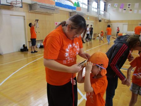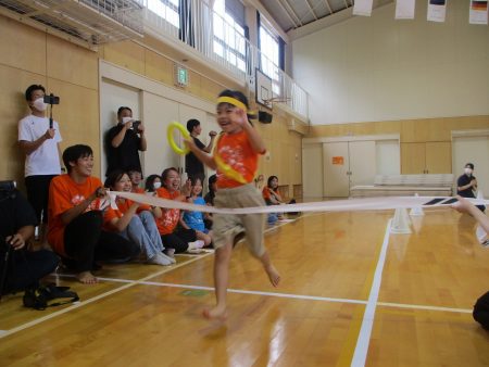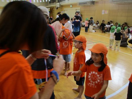 保護者の皆さんが競技をしている間に、子どもたちはハチマキを付けてリレーの準備!