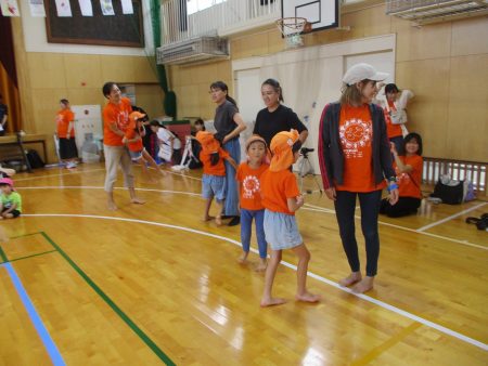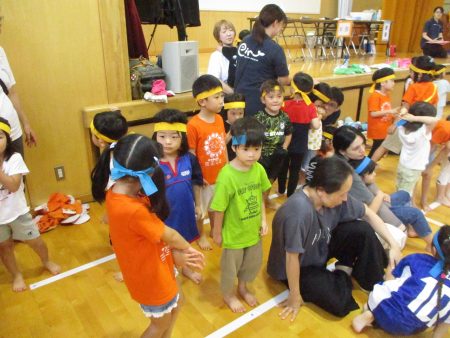 保護者の皆さんが競技をしている間に、子どもたちはハチマキを付けてリレーの準備!