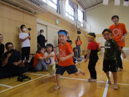 みんなでバトンを繋ぎます。見ている子どもたちも「頑張れー!!」と