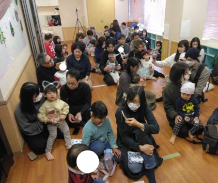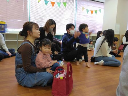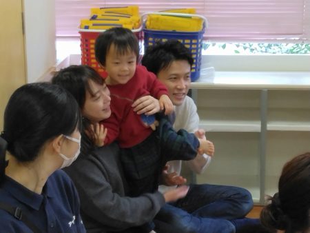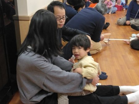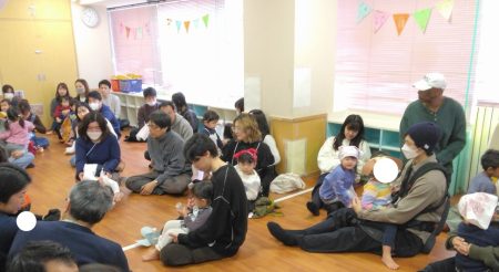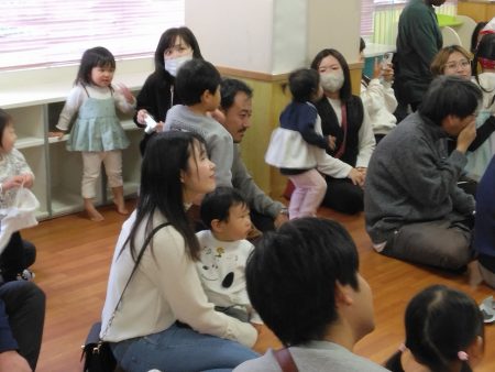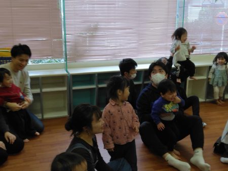 ふれあい遊びでは、『おすわりやす いすどっせ』『えんやら もものき』