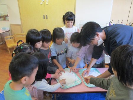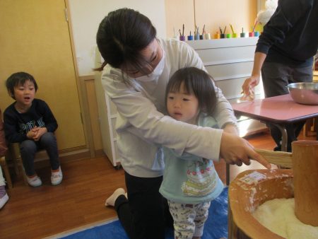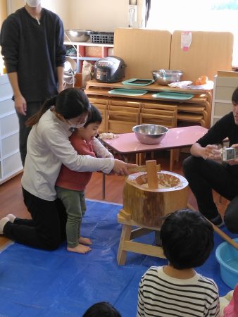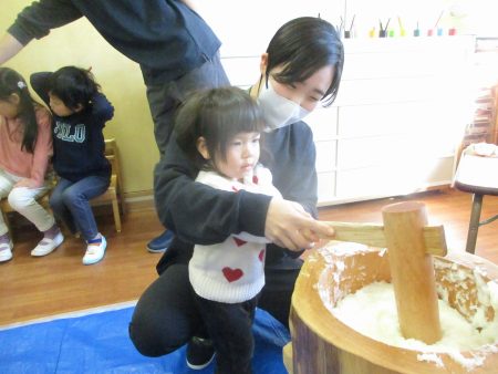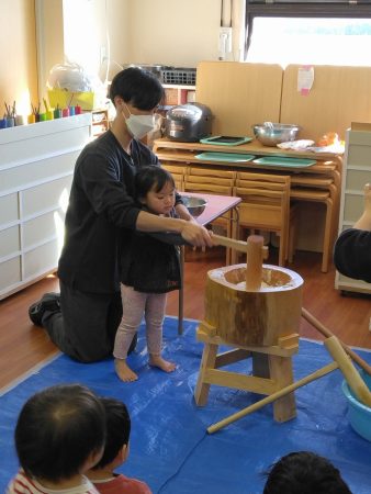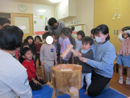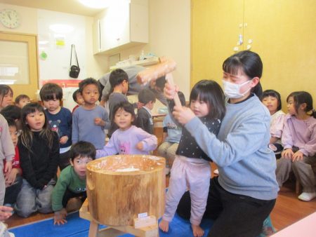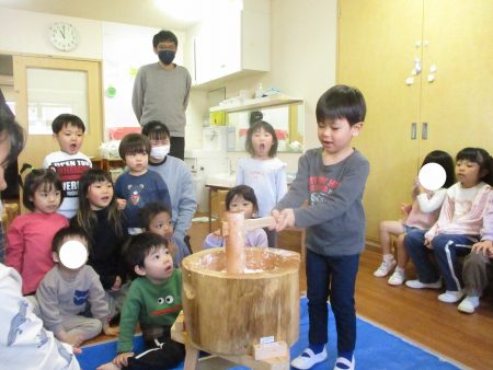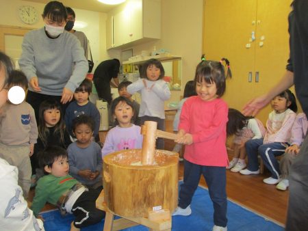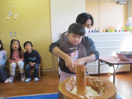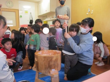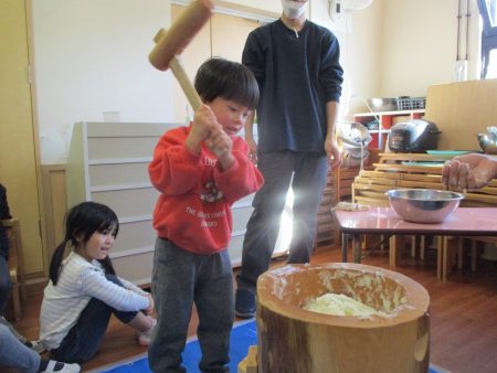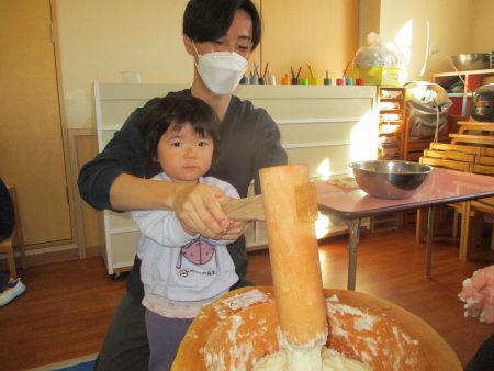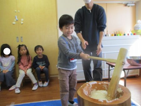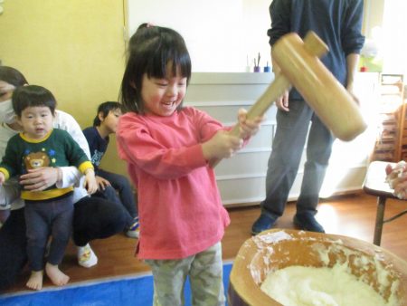 幼児になると、自分で杵を持ち上げてつくことができていました。