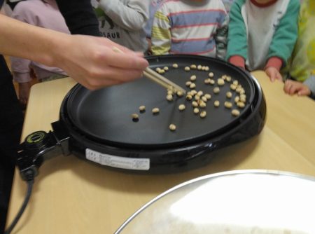 節分の豆は炒ると良いというお話を聞いたので、豆を炒る様子を皆で見ることにしました。