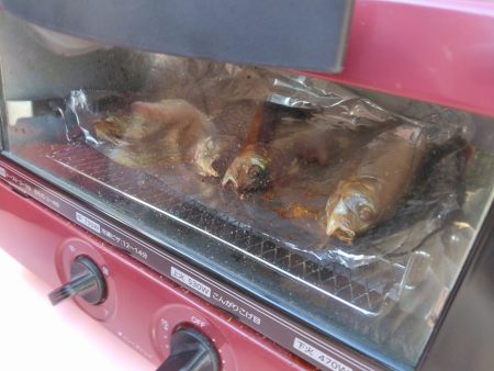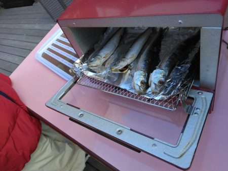 次に、焼く前の鰯の匂いを嗅ぐと、鼻を摘まみ顔をしかめる姿が見られました。