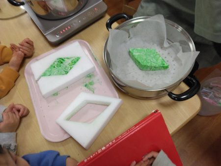餅つきの後は、幼児組さんたちがひし餅作りを開始します。