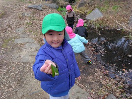散歩先では、葉っぱで船を作って川に流してみたり