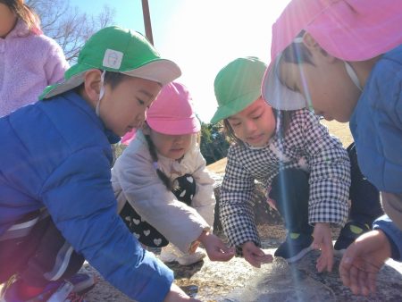 雪が降った翌日には、凍った水を触ったり雪遊び!