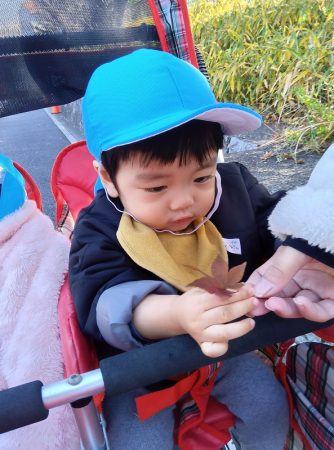 保育者が落ち葉を見せると、そーっと手を伸ばして慎重に触っていました。