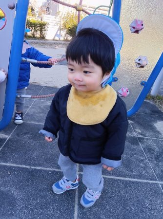 こちらは園庭を探索していますね!楽園町の園庭は少し斜面になっているのでゆっくりバランスをとって歩いていることが多いです。