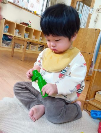 ブロックの穴と突起を合わせて、真剣な表情で繋げています!