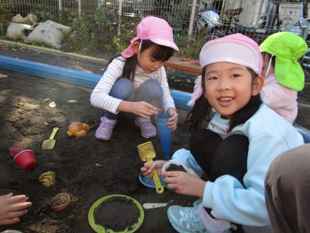 砂場遊びも盛況でした。穴掘り、山作、ご飯作り・・・作った物を小さい子に渡したりもしていました。