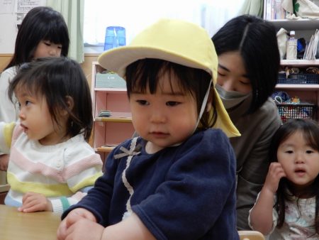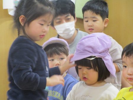 続いては、3歳児クラスちゅーりっぷグループの子達がゆりグループの子から、オレンジ色の帽子を被せてもらいました。