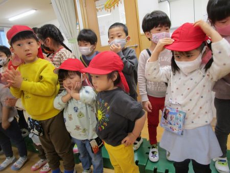 自分の被る帽子の色を見て、「オレンジ色だ!」と驚く子もいました😲
