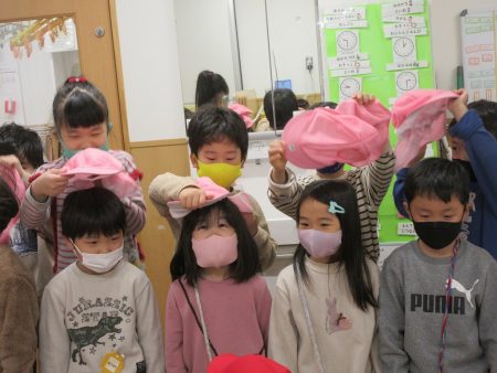 「4月からこの帽子被るの?」や「ピンク色被りたかった!」と言って、みんなそれぞれの気持ちを教えてくれました。