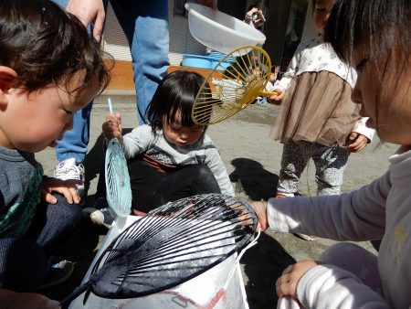 先日園庭で2歳児クラスがシャボン玉をやっているのを見て、興味津々の子ども達。
