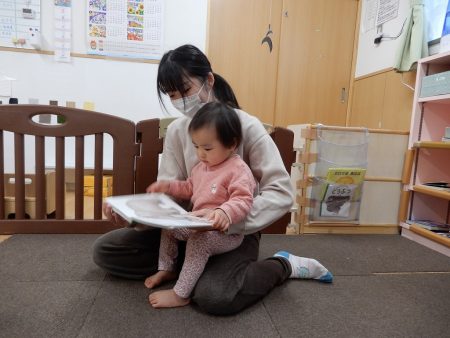 お気に入りの絵本を読んでもらっています。最近では絵を指差し動物の名前を言ったり、鳴き声や動きを真似したりしています。