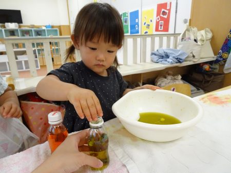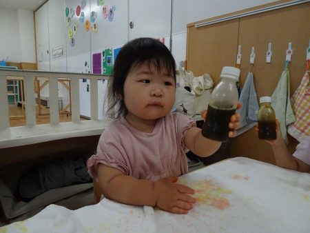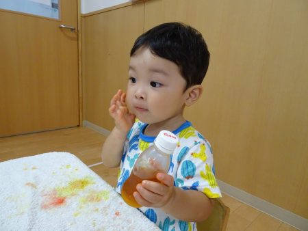手が黄色くなることに気づき、「みて!」と保育士に手を見せてくれました。