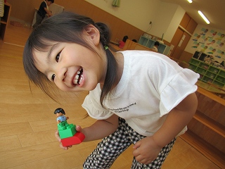 ブロックではたくさん積み上げたり、おうちや船、車などを使って楽しんでいます。