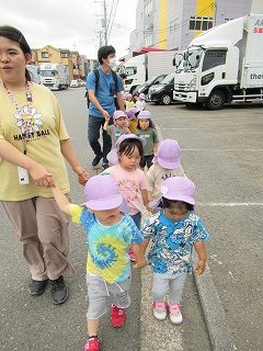 お友だちと手を繋いで、「いってきます!」と元気よく出発しました!