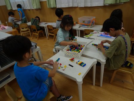 最近、気温が高く園庭に出られないため、子どもたちは、室内で自由遊びを楽しんでいます。