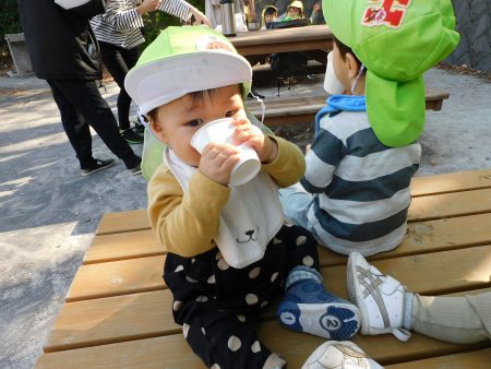 公園に到着し、皆でおやつを食べました。完了食の子はおせんべいを食べ、後期食の子はお茶を飲みました。