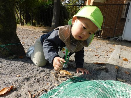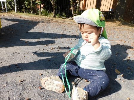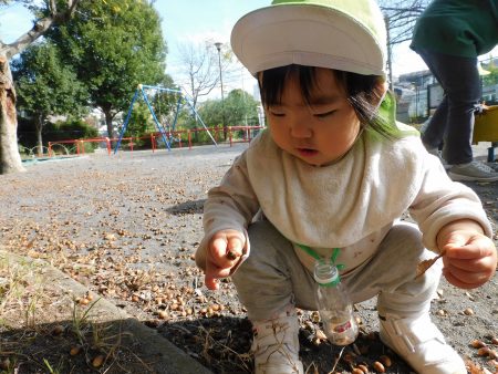 たんぽぽ組の子とも一緒に木を挟んで「いないいないばあっ!」を繰り返したり、お互い「どうぞ」と言いながらどんぐりや葉っぱを渡し合う姿も見られました。