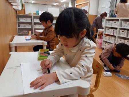 子どもたちは、室内で、ブロックを組み立てたり、折り紙で切り紙をしたり、自由帳に絵を描いたり、友だちと自分の好きな遊びをして楽しんでいます。