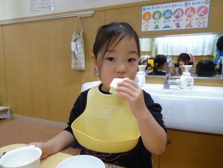 次に食パンに乗せていきます。そーっとパンからこぼれないように慎重に取り組んでいます。上手に乗せることが出来ると「できた!」と保育士に知らせる様子も見られました。