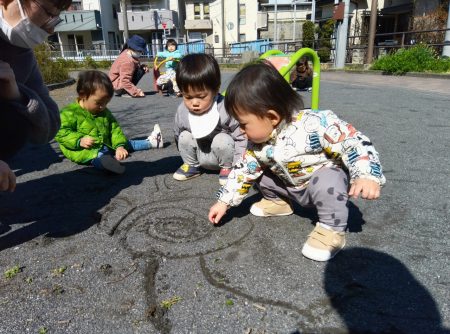 保育士が木の棒を使って砂の上にお絵描きをしていると、子どもたちも真似をしながら砂の上に絵を描くことを楽しんでいます。