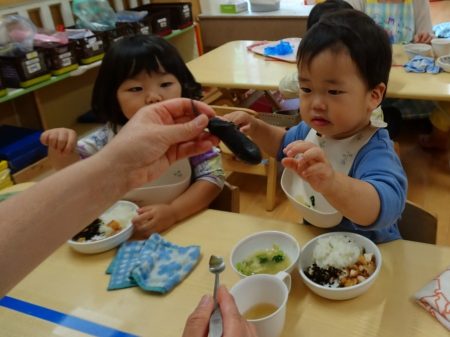 実際に園で収穫した茄子を給食で食べることができました。本物のなすを持ちながら、お皿の中の茄子を見つけて「なす」と嬉しそうに教えてくれたり、保育士を見ながらスプーンを持って笑顔で美味しそうに食べています。