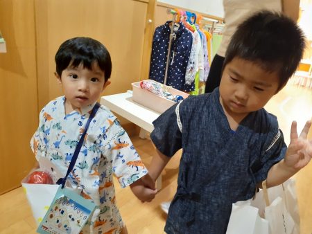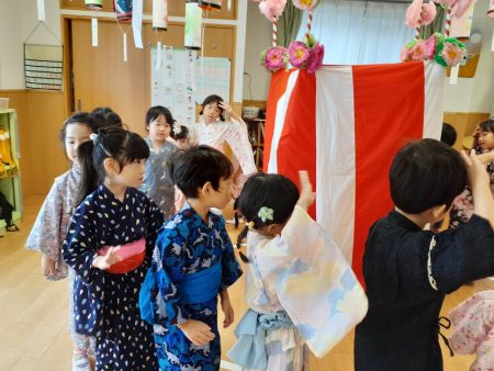 いよいよ当日。みんな甚平や浴衣を着て登園。女の子たちは「綺麗だね」「可愛いでしょ」と素敵な浴衣を着れてとっても嬉しそう。