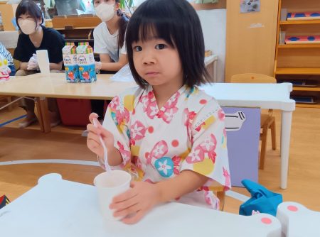 何が一番楽しかった?と聞くと「かき氷!」と答える子も沢山でした。イチゴ味やメロン味の甘いシロップをかけて、みんなで一緒に食べるかき氷はやっぱりおいしいようでした。