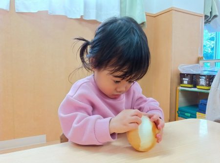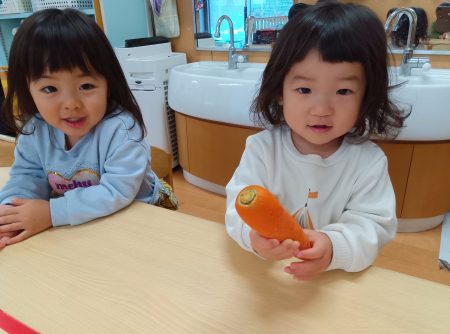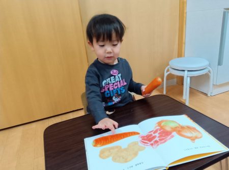 本物の野菜と絵本と見比べ、順番に触り香りや感触を確かめてみました。