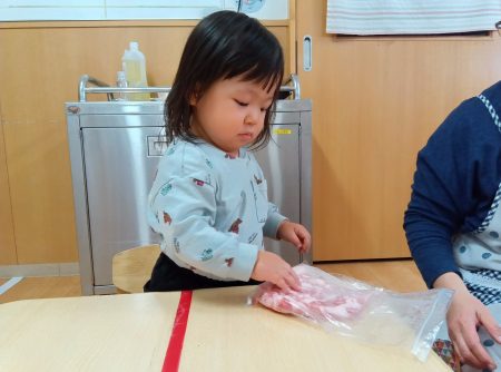 お肉は感触が面白いようで、少し慎重になりながらも何度も触っていました。