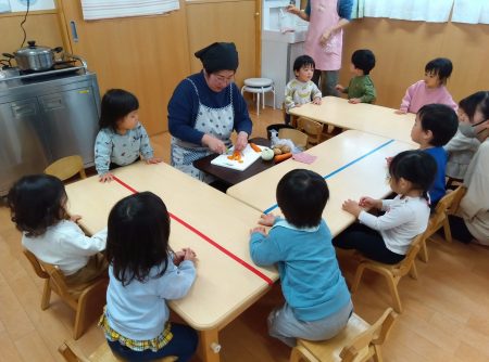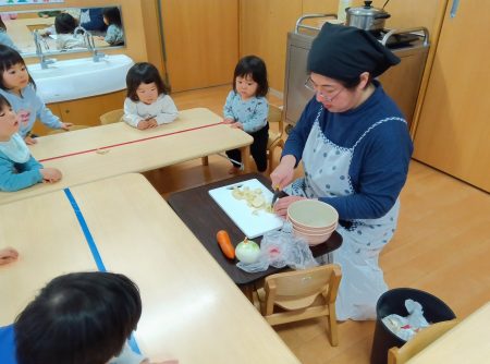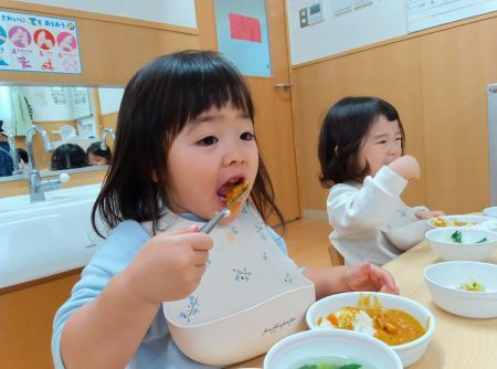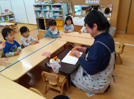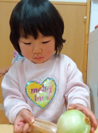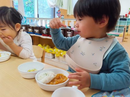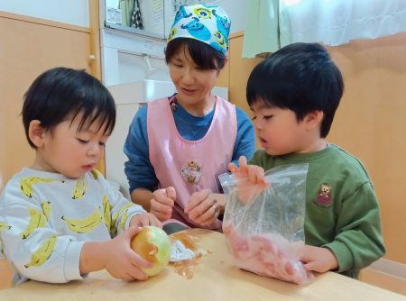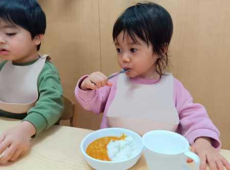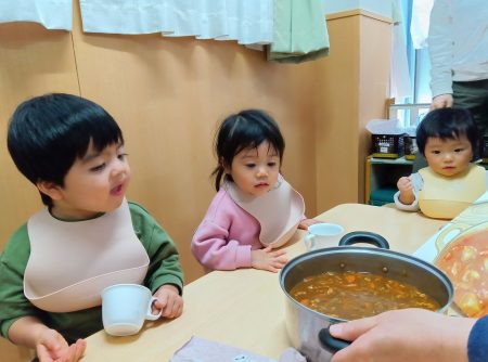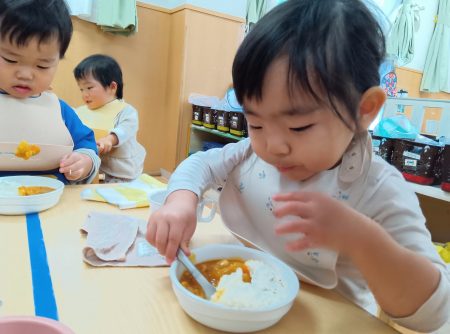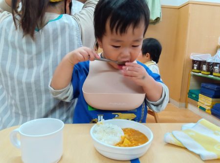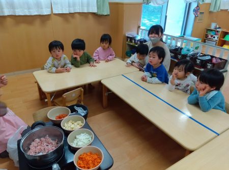 この活動後、ままごとコーナーにカレーの具材を置くと、作る工程を歌いながら美味しそうなカレーを作っている子ども達です。